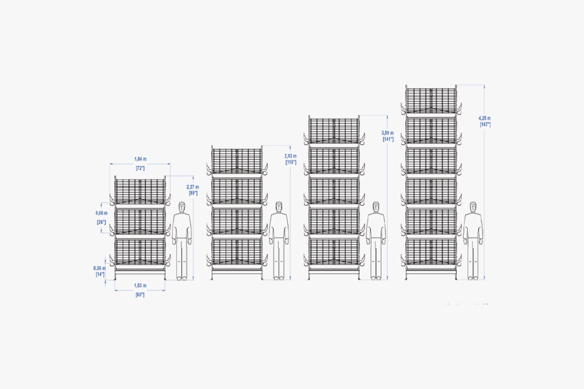 Sistema modular con soporte estructural y base de canal comedero reforzado en acero galvanizado, cada 0,60 metros (2′) en cada nivel, lo que contribuye a la resistencia y durabilidad del equipo. Con la opción de canales transitables en los niveles inferiores, permitiendo un acceso más fácil a los niveles más altos.