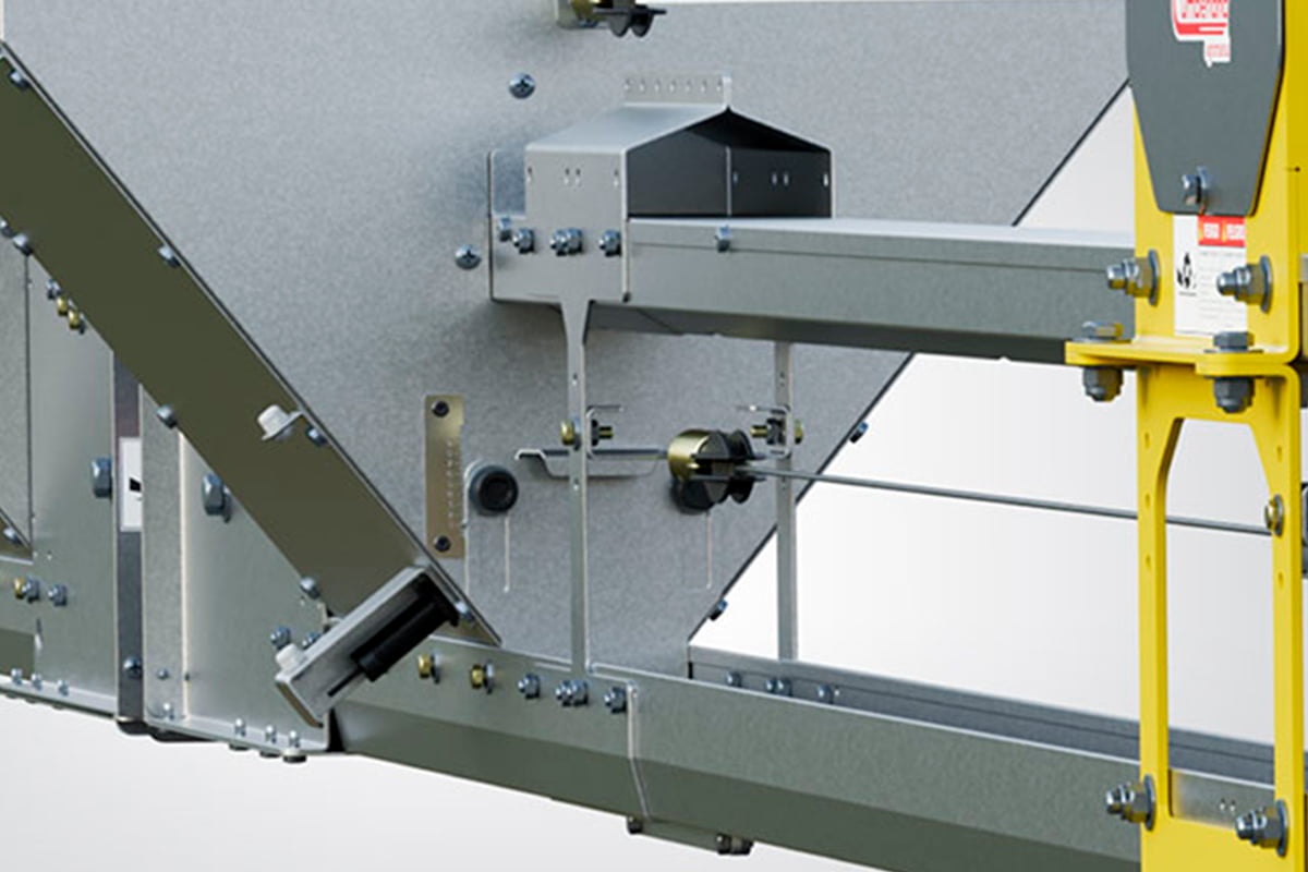 - Regla niveladora de ración con una variación de 2,5mm entre los ajustes, con encaje para evitar desajustes y ofrecer un mayor control. Sensor para detectar la presencia del alimento e iniciar el movimiento de la cadena para su distribución, deteniéndose cuando el alimento se acaba.
