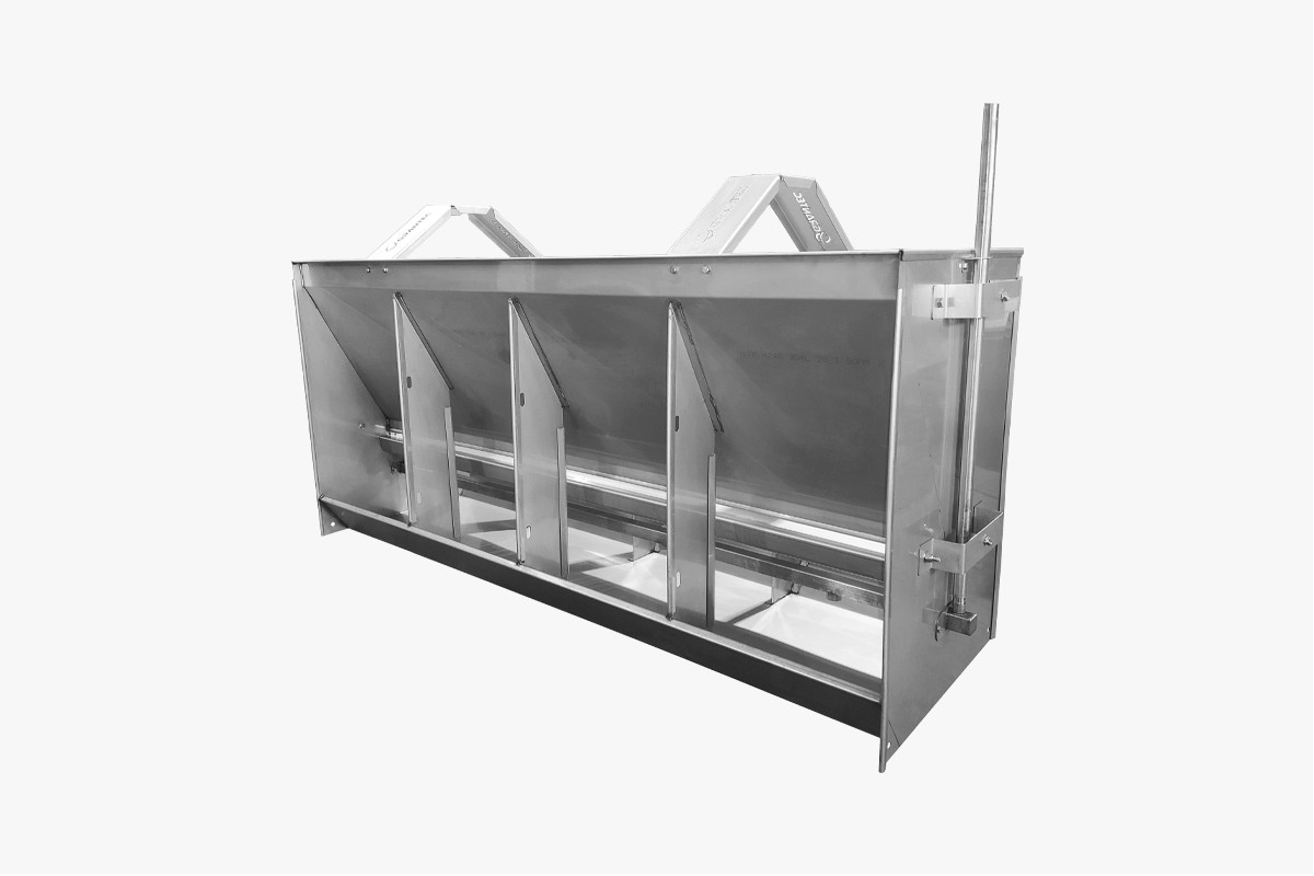 Fabricados íntegramente en acero inoxidable 304 grado sanitario, cortado con laser, plegado y soldado, otorgándoles calidad, durabilidad y robustez. Además, son construidos con la precisión necesaria para impedir el desperdicio de agua y alimento. Están libres de bordes filosos que puedan lastimar a los cerdos.