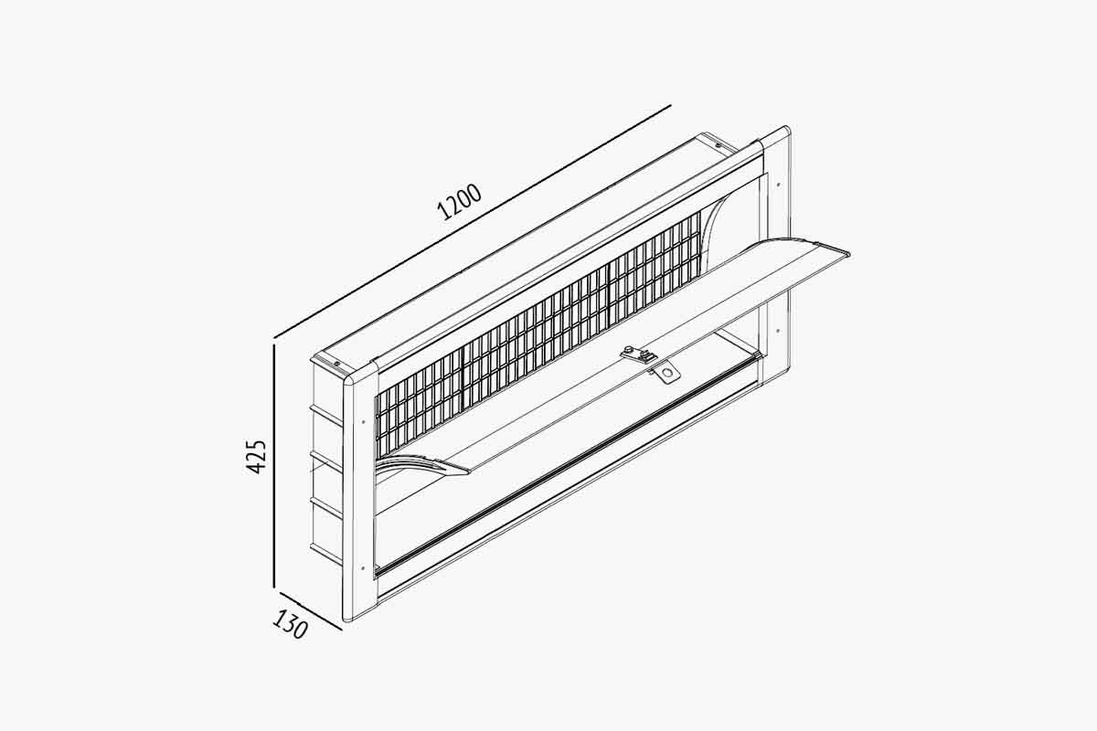 Diseñada para proporcionar el caudal de aire necesario de ventilación mínima, dirigiendo el flujo que ingresa por el deflector galvanizado exterior hacia el techo del galpón gracias a su forma “pico de pato”.