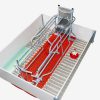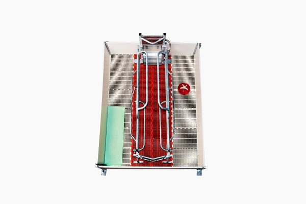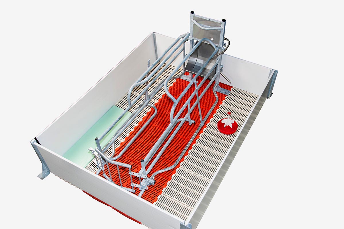 – Jaula de fabricación propia, construida de acero con tratamiento de galvanizado por inmersión en caliente, otorgándole durabilidad y resistencia a la estructura. Su diseño funcional permite regular el ancho de la jaula para adaptarse a la fisionomía de la cerda durante los períodos de parto y amamantamiento. Además posee un par de barras anti aplaste que evitan que la cerda aplaste a los lechones y barras reguladoras de altura para separar las líneas mamarias de la madre y de esta manera, impedir que los lechones se aplasten entre ellos.