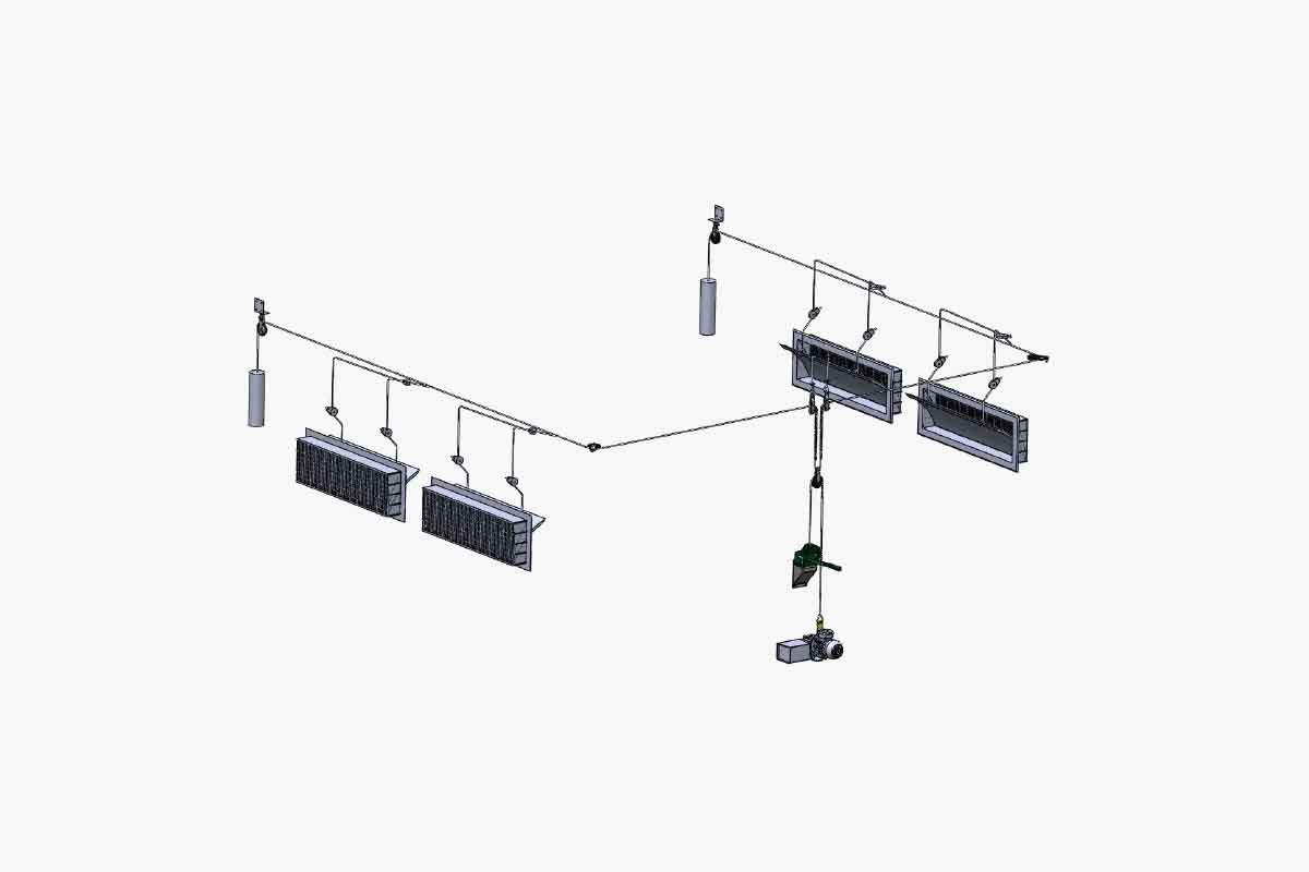 El conjunto de accionamiento automático se compone principalmente por motorreductor con carretel de enrollamiento, cables de acero, poleas y accesorios de instalación comandados por un controlador electrónico de ambiente, que se vincularán al elemento que se desea mover; ante una falta de energía eléctrica se dispondrá de un malacate para movimientos manuales. Cada configuración del circuito de accionamiento dependerá de las características constructivas de la nave.